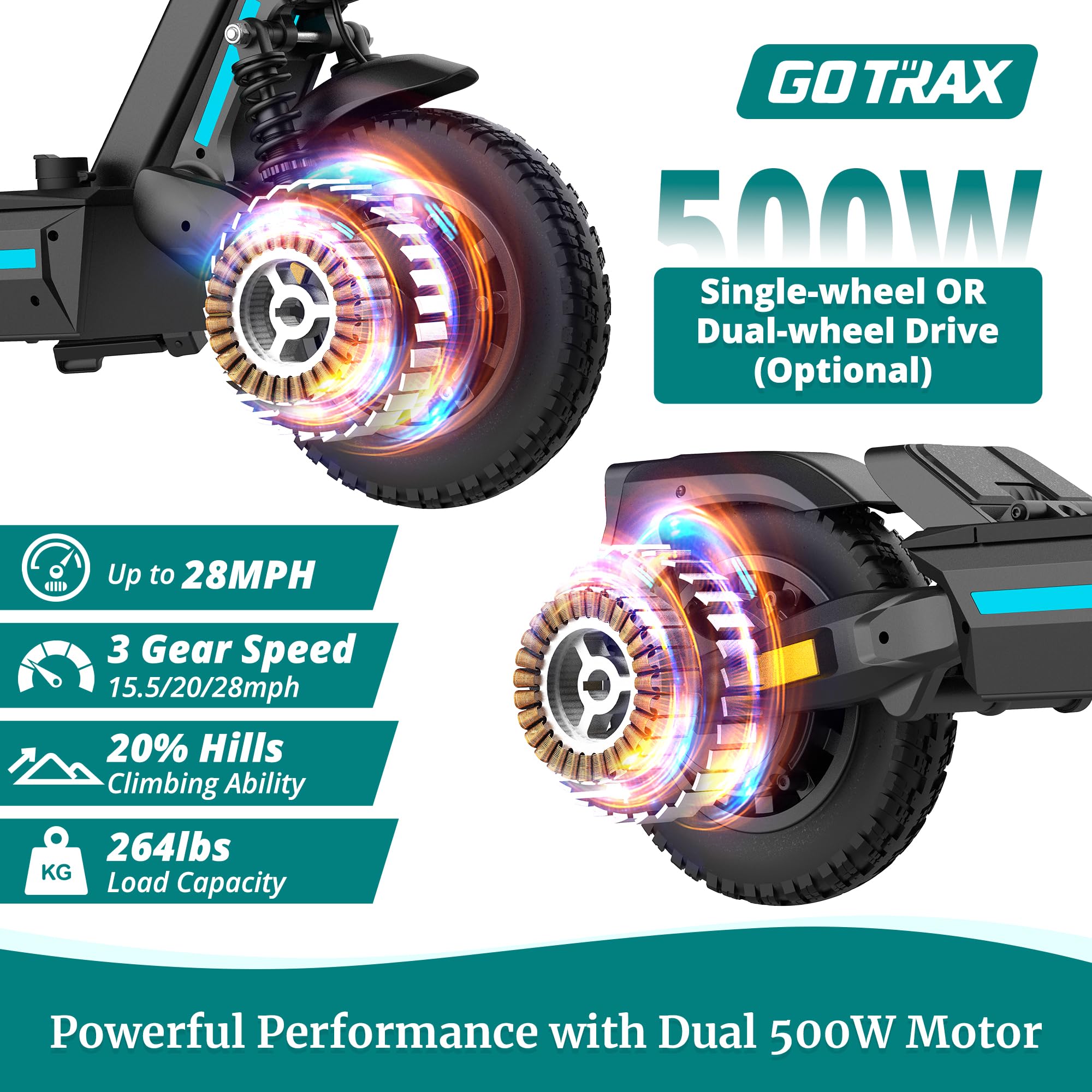 - Dual 500W Motor & 25Miles Ranger: The Gotrax ARES electric scooter use dual 500W motors make it reach up to 28MPH max speed and 25 mile max range. It conquers 20% hills. Powerful and durable, it easily supports riders up to 264 lbs.